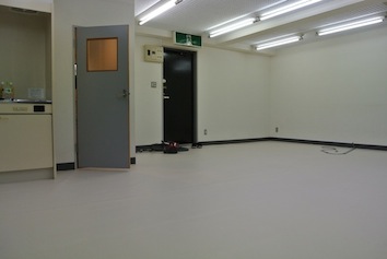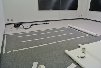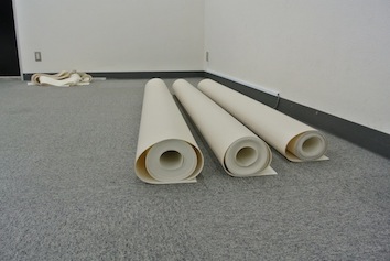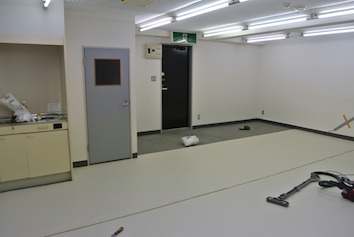 そこの床張りをしていました。まぁ、床張りと言ってもタイルカーペットの上に