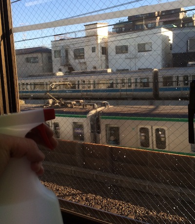 少量の洗剤を溶かした水をスプレーを使ってまんべんなく窓に吹き付けます。