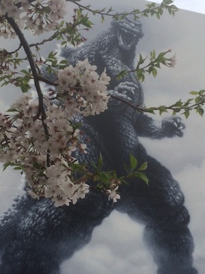 東宝スタジオの壁面に描かれたゴジラと桜のツーショットです。